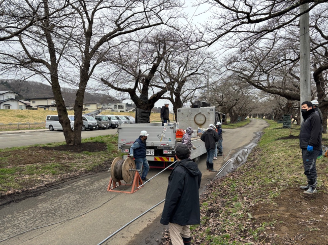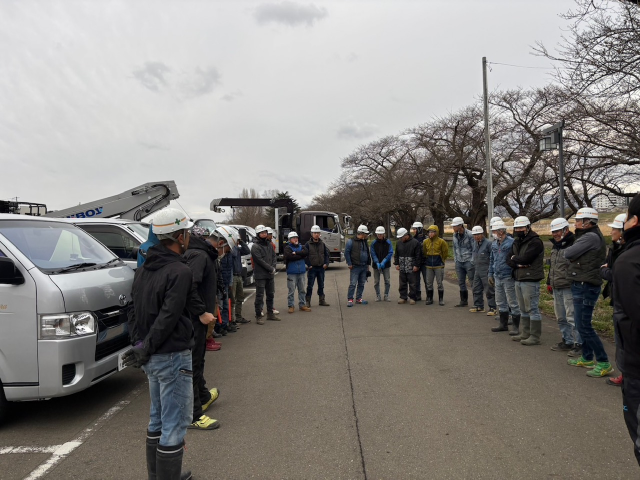 社員一同、子供の頃から見てきた北上市の風物詩である展勝地こいのぼりの掲揚作業に携わる事ができ、感慨深く、技術的な面でも非常に良い経験となりました。