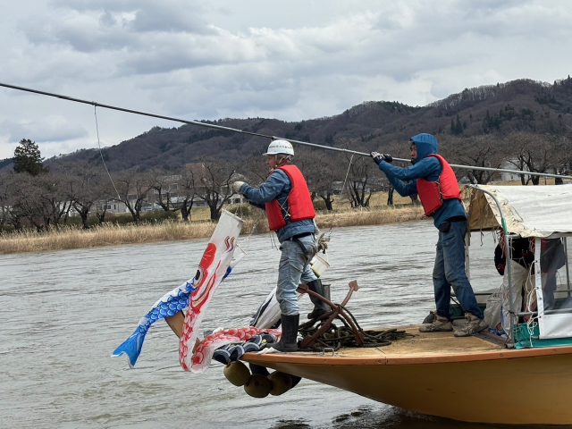 北上展勝地から対岸の川岸地区まで283m、約150匹のこいのぼりを無事に掲揚しました。